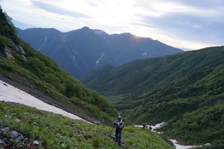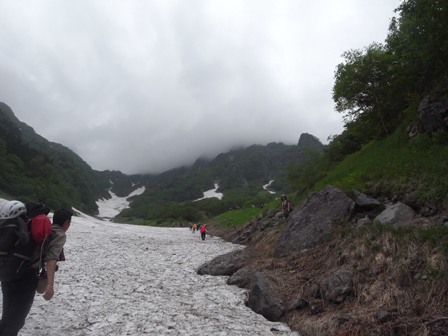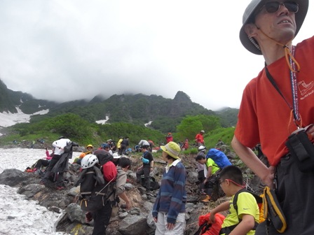 混雑していたので雪渓に出て、二俣へ向かっていると、N氏一家と遭遇。