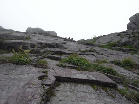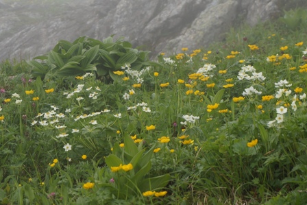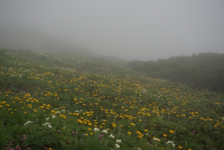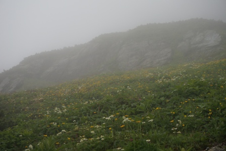 最後の関門を越えて、稜線まではお花畑が広がる。青空はなくパラパラと降ってくる中で山頂着。