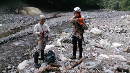 沢靴に履き替えて下降開始。いくつかの堰堤を下って出合のゴーロへ。