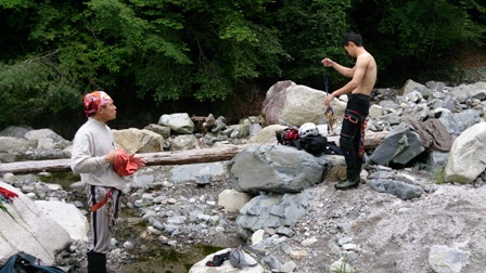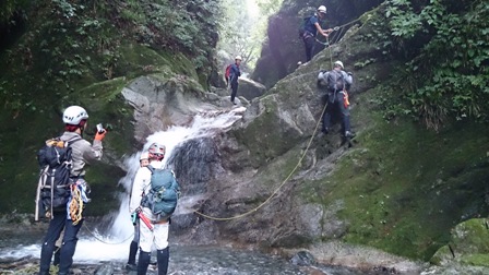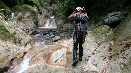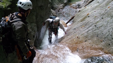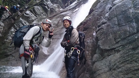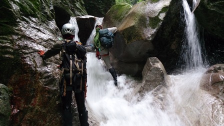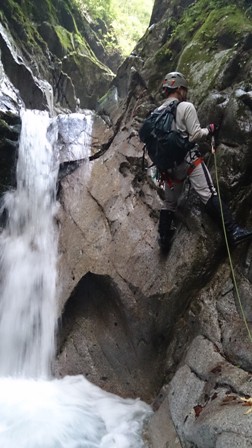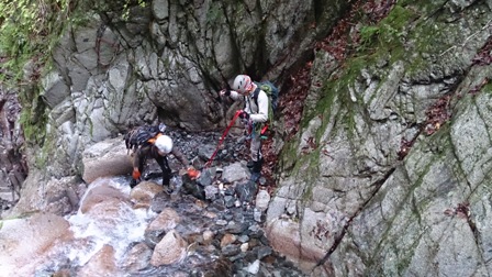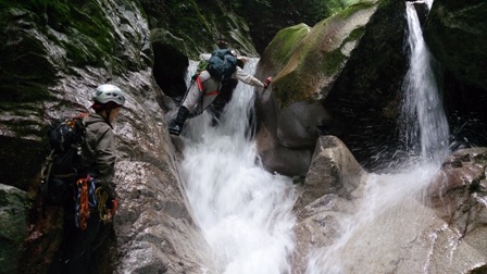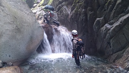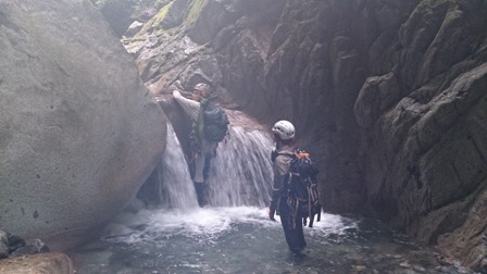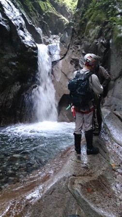 核心?のスラブ状滝は取付いてみるも皆突破できず右から巻き直ぐに下降してゴルジュ突破。