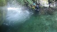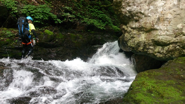 ヘリポート脇から下降してすぐに入渓。降り立ったところは河原だがすぐに水流の多い沢へと変貌。