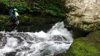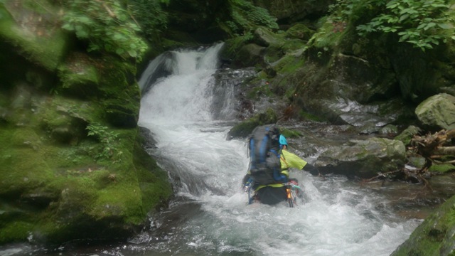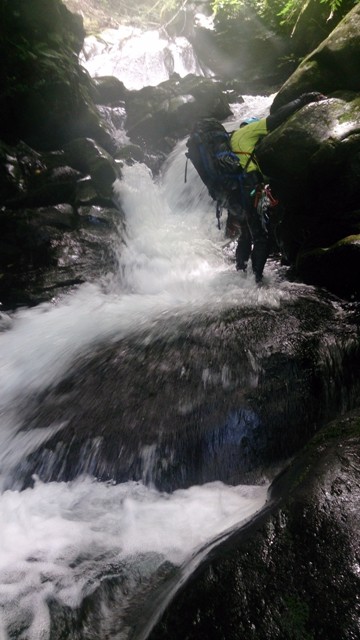 ホチの滝を過ぎると核心のゴルジュ。右奥に目立つお助け(2段目用かな)が垂れているが水流が強く無理。巻いてしまおうかとも思ったが、左にハーケンが打ってあり支点もとれることから登ることにする。こちらは見た目ほど難しくはない。