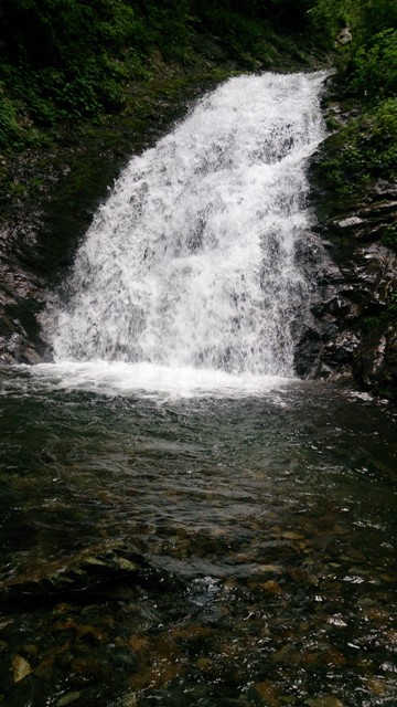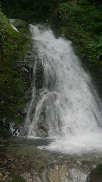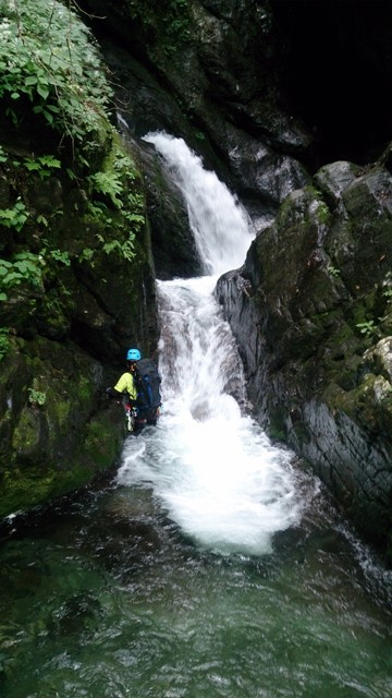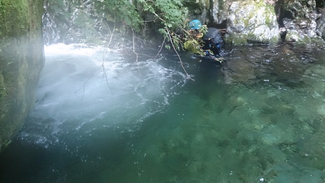 続く3mは丸太を馬乗りに左岸に渡りトラバース。こっちの方が悪かった。 このあとも深い釜と水流激しい小滝を越えるとトオの滝に出くわす。