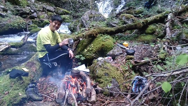 ツエルトを張り終えると、Nさんは持参したノコギリで近くの倒木を切りだす。盛大な焚き火と食事で夜更けをまった。