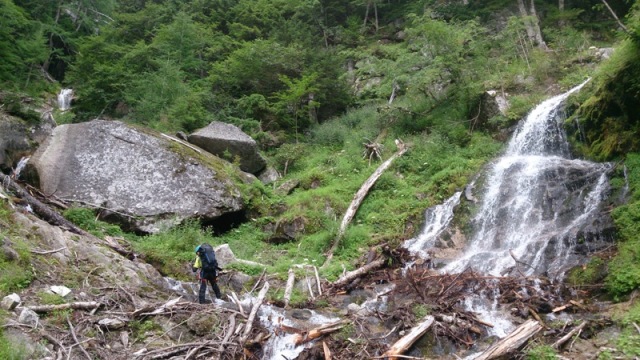 翌、5時にテン場を出発。自分は靴の履き替えと沢靴のドロつきを嫌って登山靴で歩きだすも、目の前にあった滝でやはり躊躇。この一滝を越えれば水は無くなるのだけど大変だった。