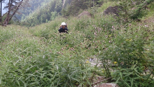 水流がなくなってくるとアザミ地帯が出没。花のきれいな時ならまだしも、否そんなことないか。針地獄。