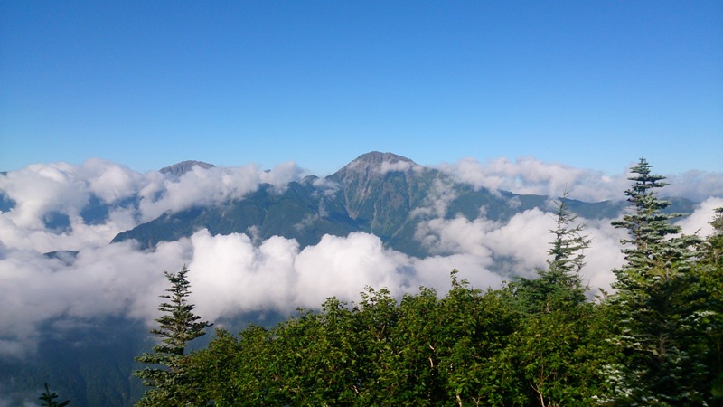 水の無くなった沢筋をたどって樹林帯に入り、200mほど上がったところでハイマツをちょっと漕いで登山道へ抜けた。やっぱり青空を見られると気分が上昇する。
