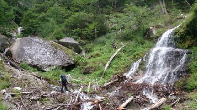 倒木帯といくつかの易しい滝を過ぎると左からきれいな連漠を持った枝沢が入る。