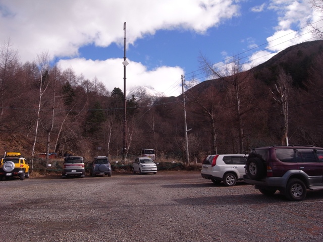 12時30分頃になって兎も角やっと、赤岳山荘に到着。付近に雪はなく、車もガラガラ。