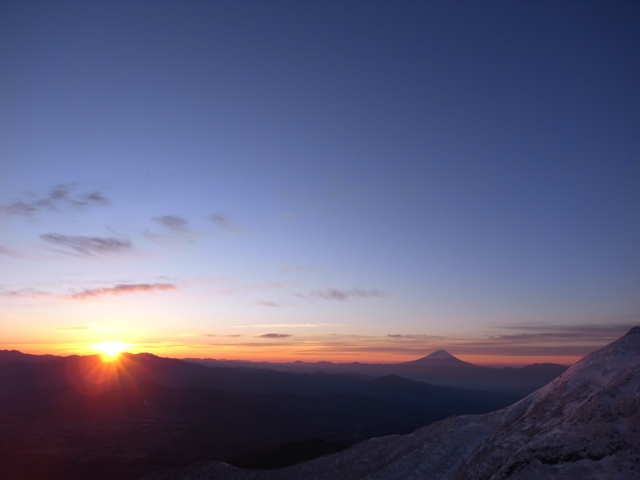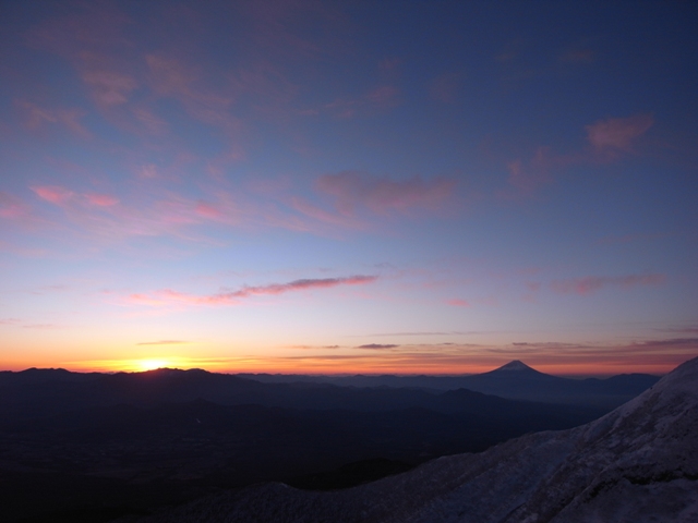 その後、硫黄小屋から登り返した台座の頭付近が6時過ぎ。横岳まではちょっと遠いし、稜線から東にそれたところで風が防げたので、ここで日の出を待つことにする。4,50分の大休憩。
