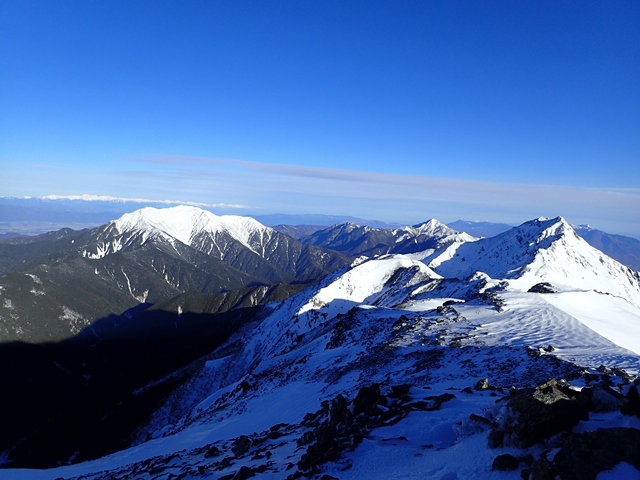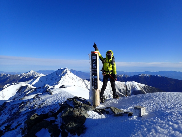 数年前に来た時はここで下りてしまった。時間的にちょっと読めないが、これだけの天気、阿弥陀岳の山頂まで行こうとNさんを説得し、ガチャ類をデポし上へ。