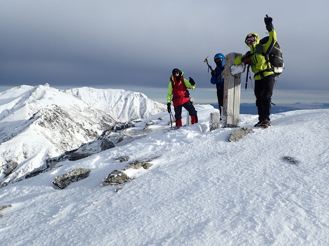 檜尾岳の頂上にはテント場からアイゼンがやっと刺さる凍った斜面を登り15分ほどで到着。