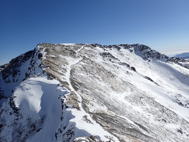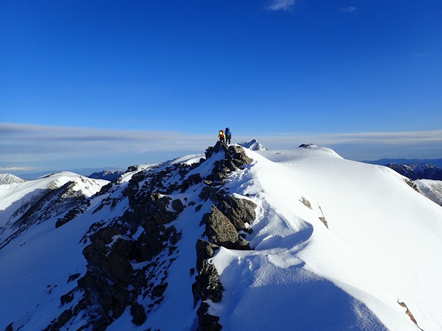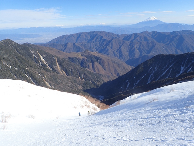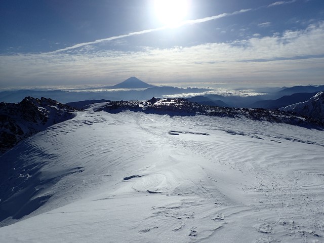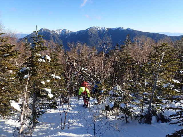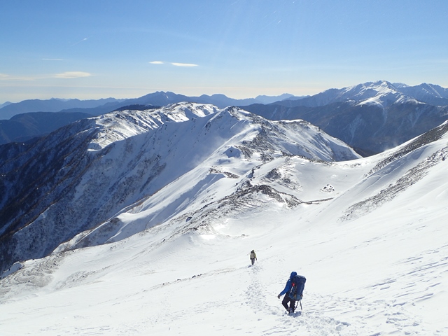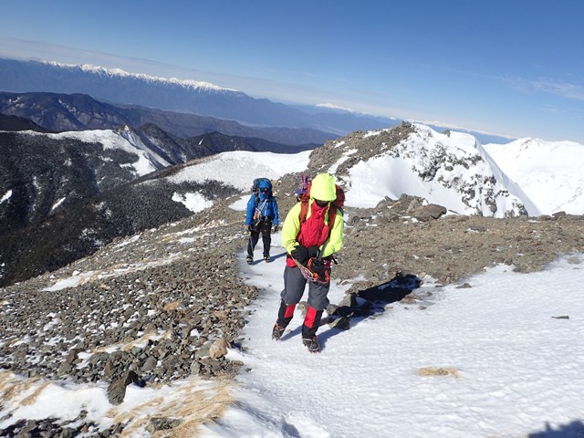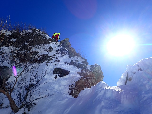 昨年とも比べても雪の少ない稜線までの斜面を喘ぎながら登る。