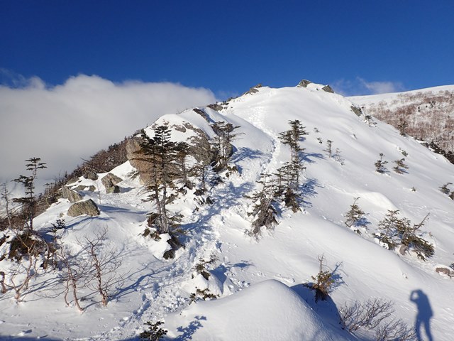 事前に調べたらここの下降は悪いので岩尾根上を忠実に行ったほうが良いとのことだったが、アイゼンの跡に誘われて夏道ルートに入ってしまう。