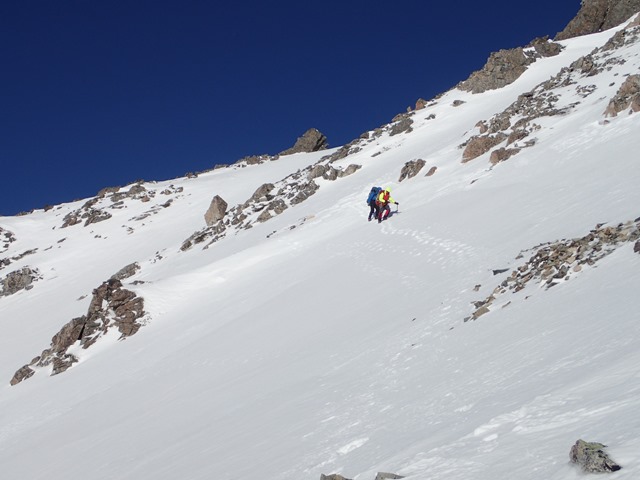 単なるトラバリなのだがアイゼンをつけていても蹴りこんで爪が刺さったことを確認して体重を預けないと、いわゆるアイゼンが滑る状態になる。