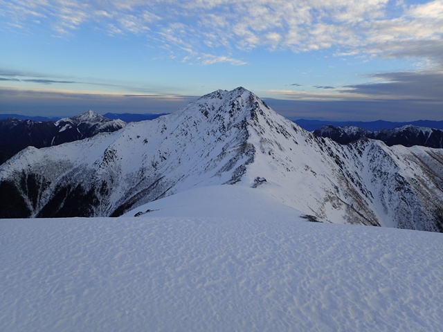 北を振り返ればピラミダルな北岳の脇に仙丈岳・甲斐駒・遠く八ヶ岳が控えている。