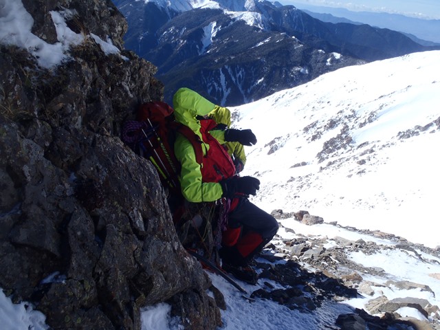 変な安定していない氷化した斜面をトラバース気味に登るより、夏ならもろい岩場でも冬となれば雪や氷でがっちり固定されているので、ザイルを張って万が一の転落に備えれば、あとはしっかりホールトやスタンスを決めていけば10m位なので簡単に通過できてしまう。