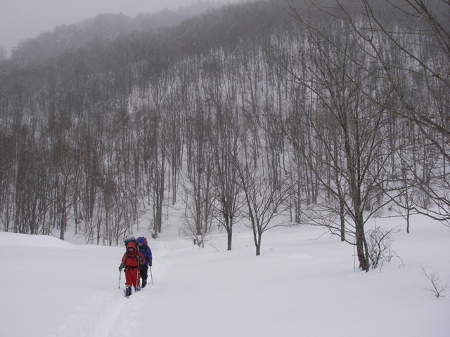 1時間30分掛かって標高200m稼ぐのが精一杯。おまけに雪が多量に降っており、後ろをみると自分たちのトレースが埋まっていく。