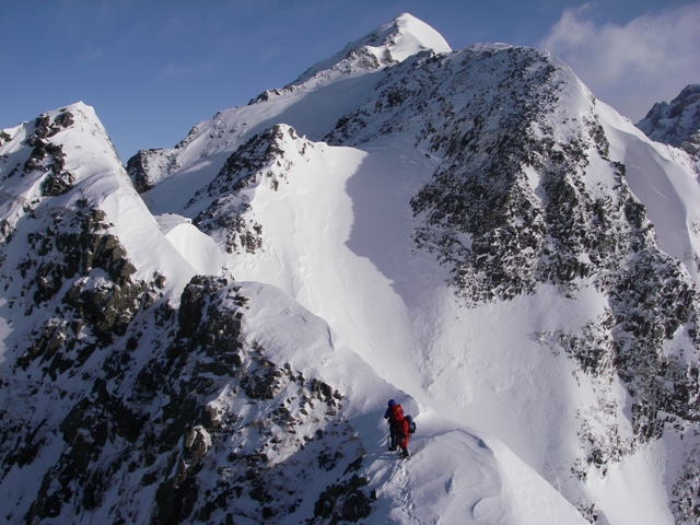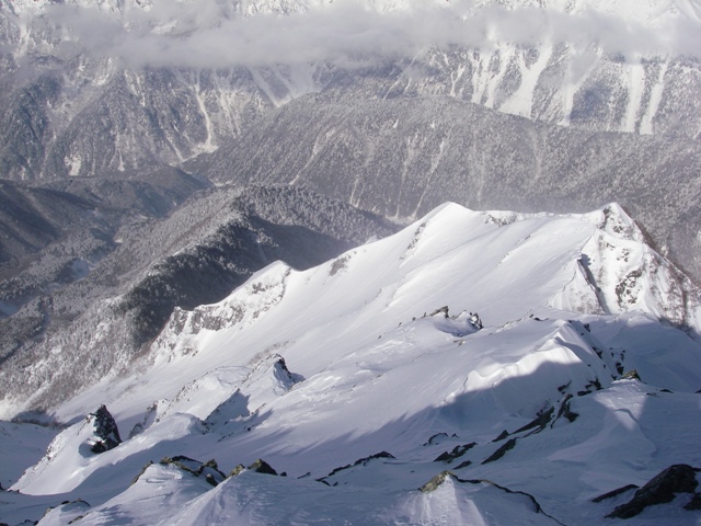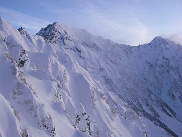 尾根がやせて蒲田川側の氷化した斜面のトラバースが始まる。