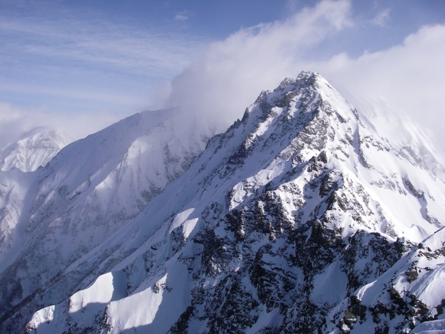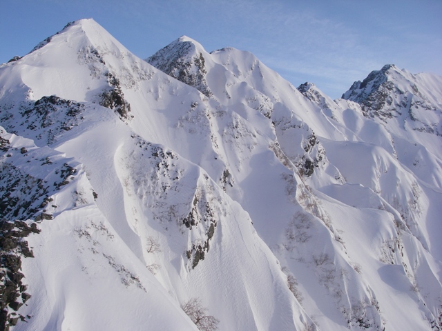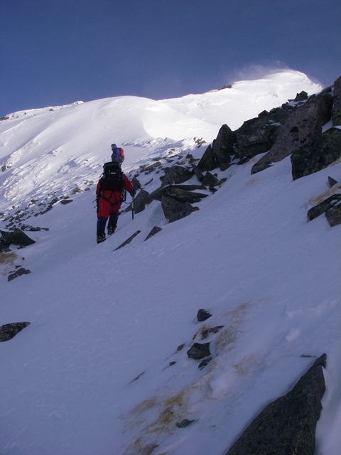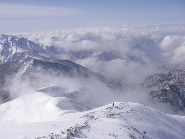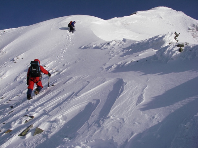 丸山に出ると風で雪が吹き飛ばされラッセルは無し。アイゼン効かしての快適登高。