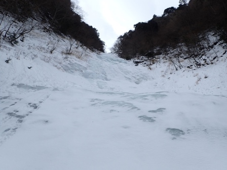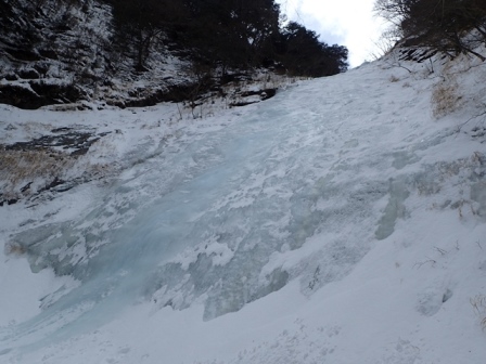 肝心の乙女ノ沢は完全結氷だった。全体的に傾斜は50°〜60°でゆるいが傾斜が連続して続くのでアイゼンのフロントでの立ちこみを余儀なくさせられふくらはぎが痛くなる。