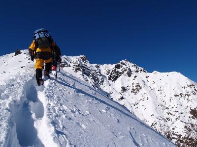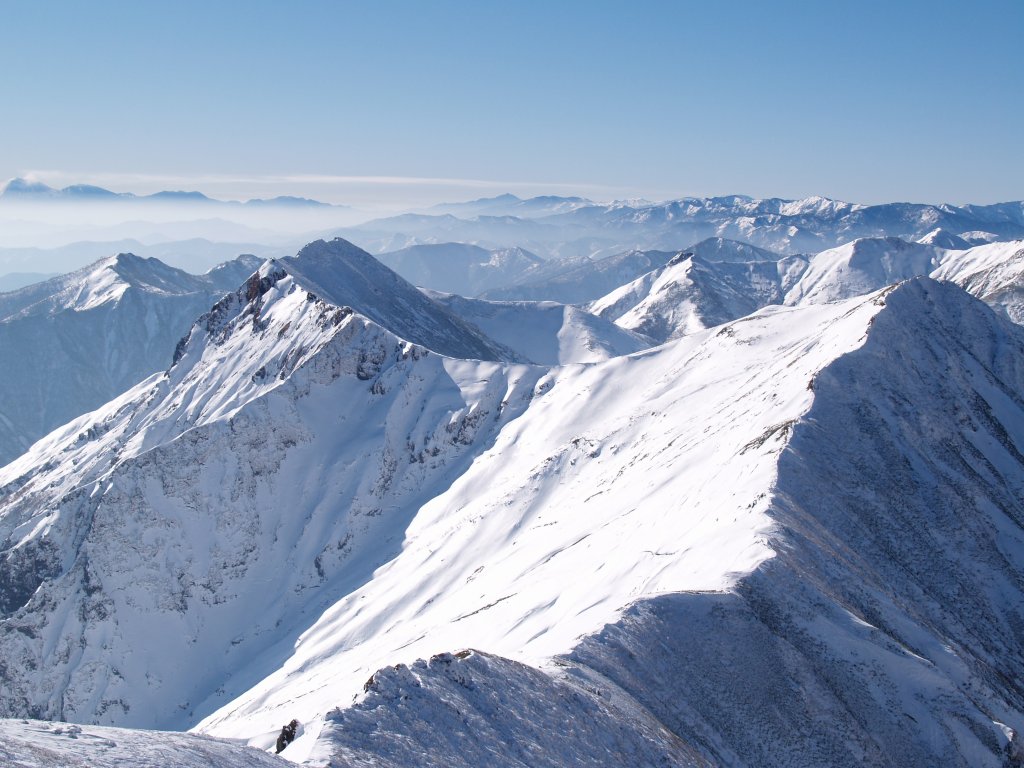 鉄塔で一休みし更に急登を喘ぎながら高度を上げてゆくと視界が開け快晴に白く輝く峰々が視界に拡がってきた。