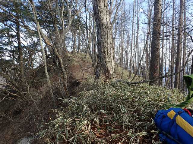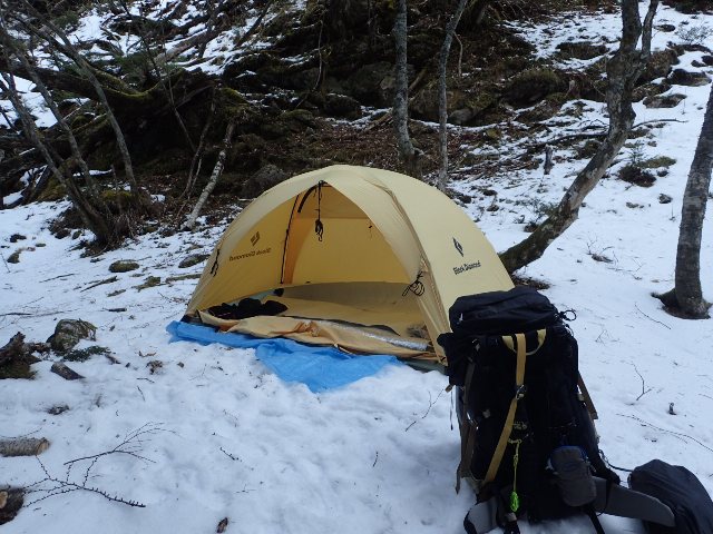 殆ど風が無いのと気温が高めなので標高を上げても全く寒くなく、シェル・フリースをすぐに脱いで歩いた。 チェックポイントの刀利天狗あたりから道がところどころ凍結していて歩きにくくなってきたのでアイゼンを装着した。年末年始に剱岳早月尾根で重荷を背負って歩いた経験が生きて順調に高度を稼いだ。ほぼ予定通り休息込み約5時間で1,500mほど上がり、12時頃より千丈の岩小屋を目指して下降を開始した。ここまで順調に来たが、この下降で思わぬ苦戦をしてしまう。 ルートガイド『日本のクラシックルート』では支尾根沿いに赤布に従って下降とあった。そこで尾根を追うとするあまり、右寄り(下流方向)に逸れてしまった。降り着いたのは千丈の滝の下方、標高約1,630m地点。下降に想定時間の倍を使ってしまい15時になってしまった。上流へ向かうことは諦めてそこで幕営とする。 一つ良かった事は、沢の氷の薄い所を叩き割って水が取れたこと。おかげで時間と燃料が節約できた。天気予報通りに夕方から少々雪が降る。沢筋でもあり風が全く無く厳冬期とは思えない快適な夜だった。