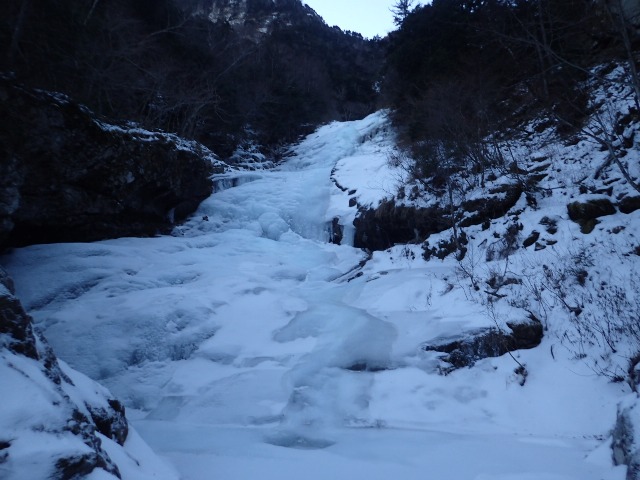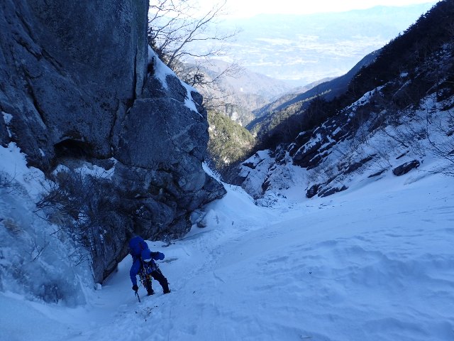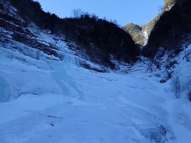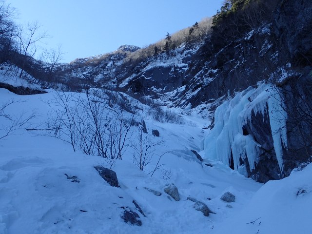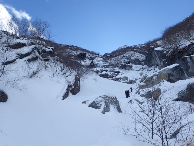 名4〜5パーティーだった様子だ。 奥千丈の滝を越えて程なく上部のインゼルに達する。この頃から沢が少しずつ開けてきて先行の3名とその先を行く2名が見える。幕営ポイントとされているインゼル上部の60m滝を先行3名が左側を巻いて通過していた。先を急ぐことを考え迷わず「巻こう」と言ったが、この右岸の巻きが僕にとって今回の山行最大のピンチとなった。 急斜面の部分で氷結していない岩の上に薄く雪が積もっていた。雪が深くしっかりついていればなんてこと無いが、一枚岩の上に積もった雪に乗込んだとき足場の雪が新聞紙大の大きさで崩れて岩が露出した。手が効いていたので助かったが、一瞬落ちそうになった。その後手足のいい置き場が見つけられず。 登るムーブ探ったが次に一歩乗込む左足場(猫くらいの大きさ)の雪が崩れそうな感触だった。両手(バイル)も岩の上の薄雪にしか置けず有効な岩の窪みを見つけれなかった。「イチかバチかいくか」とも思ったが、もし足場の雪が崩れたらバランスが変わり手も同時に外れそうなので少し動いて止めた。笛を吹き、既に突破していたORさんにロープを下ろしてくれと救援依頼した。その後上からのロープを着け、考えたとおりの動きで行きノーテンションで突破できた。時間は掛かってしまったが万一足場の雪が崩れることを考えたら無理しないで良かったと思う。
