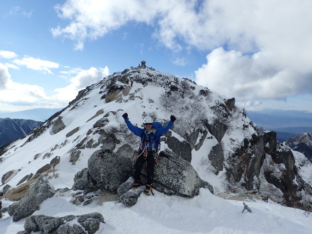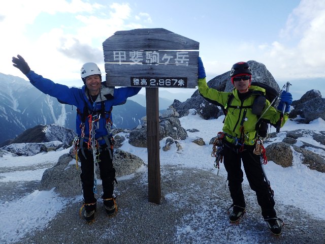 其処を突破した後は、頂上へのツメ上げ残り標高差300m程度だった。 殆どの箇 所は急雪面の階段状か、這い松上の雪、所々に岩の上のうす草付きに雪が乗っている状態の所だ。 いつもなら体力がものを言うツメ上げのようなパートは得意とする部分だったがこの日は違った。アイスのパートでの蹴り込みや先ほどのモタツキで消耗し、ついて行くのがやっと、というかついていけてない状況となった。まだまだ修行が足りないなと思った。 頂上まで残り歩行70m程度の地点で黒戸尾根に出た。この日の登りパートのフィナーレ、とても気持ちのいい花道だった。体力的・技術的に自分の力を出し切って登ってきたので、甲斐駒ケ岳の頂上でとても充実した気分と登頂の喜びを感じた。 頂上で一通り写真を撮り、登攀具をしまいヘッドライトを準備して下山を開始した。七丈小屋のテントサイトには予想より早く着いたがとても疲れていた。小屋で水が入手出来たので水作りの手間が省けて助かった。小屋で缶ビールも買った。登りの緊張感から開放されて飲んだビールは旨かった。
