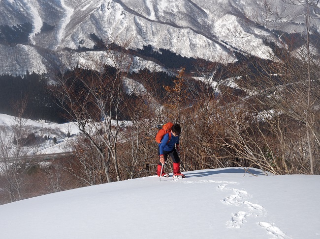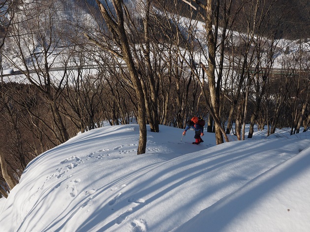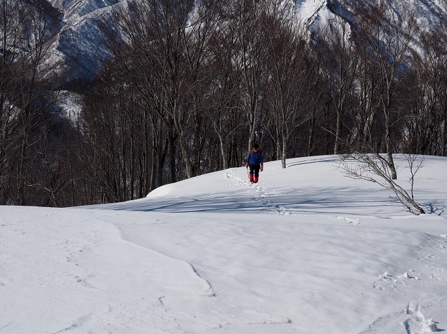 部分的に固く、潜ると深いラッセルにワカンを取られながらの急登が続く。