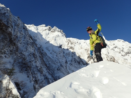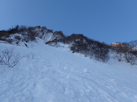 ルートグレードは『チャレンジアルパイン』では2級上(所要時間6〜8.5時間)、『冬季クライミング』(新版)では3級下となっている。前回、最初の懸垂ポイント(木のある小ピーク・コル)までは前進していた。今回はそこの通過時刻は7:30。「その地点が全体の1/3位かな」と思っていたので、「順調に来てる!」と感じた。「8時間もあれば抜けられるだろう、だとしたら頂上は14時位かな♪」なんて考えていたが、甘かった。小ピークでロープを付けてから予想を上回る時間が掛かった。小ピーク以降さらに傾斜が急になる。このルートのハイライト・核心部分は上部のピナクル帯だが、長く続く灌木交じりの急雪壁で集中力・体力・モチベーションを切らさずに動き続けることがこのルート攻略の重要なポイントだと思う。所々に出てくる傾斜が急な部分ではアックスを確実に効かす、抜けたり折れたりしそうな微妙な太さの小枝を雪から掘り出して握り、崩れそうな雪のステップと小枝に体重を分散して体を上げる、シッカリした枝を掴んで「手に足」ムーブで乗り込んでいく等で高度を上げていく。一つ一つの動きはそんなに難しくはないが、もし失敗して落ちれば絶対に止まらない様な斜面を延々と登る。 小ピーク後の急雪壁は大部分をコンテ・同時登攀で登った。