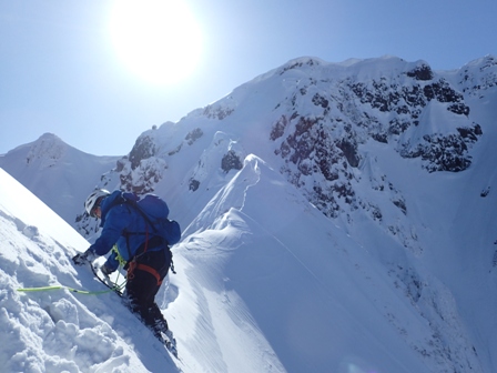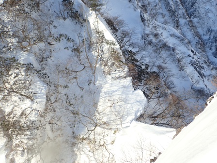 ピナクル帯は入れ替わりが難しく交互に行けないと思っていたが、意外にそんなことは無く、交代で進んだ。核心部分は全て馬乗りで進んだ。ピナクル帯の終盤で後続パーティーがピナクル帯の入口に差し掛かっているのが見えた。「すごい所に立ってる〜!」と思った。そこまでただひたすら夢中で登っていて、後ろを気にしてなかった。ピナクル帯を抜けた時、「一番心配な部分は終わったわ〜」と一息ついたが、目の前に見える灌木まばらな急雪壁に「まだまだ安心できないな。」とも同時に感じていた。進む方向のほぼ正面に太陽があり、まだまだ続く急斜面を逆光で見上げた。