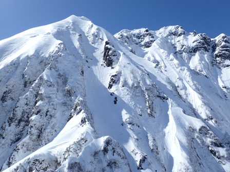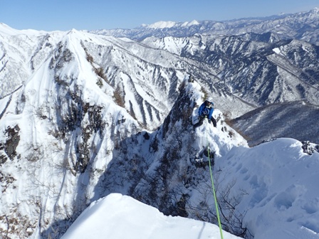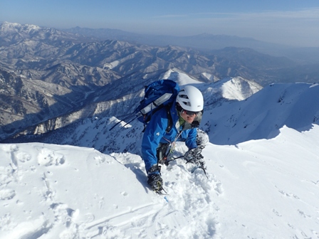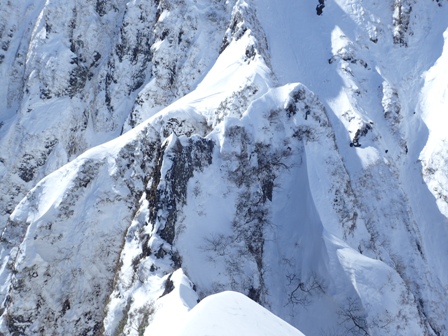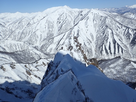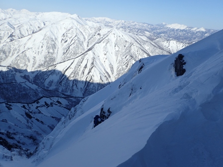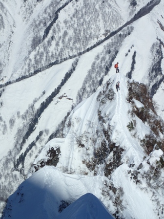 ピナクル帯の入口、15m程の下降ポイント手前のピークには最初にORさんが到着した。スタカットで少し下まで辿り着いた時、「この先だよ」と言われた。「懸垂か?」と思わず聞いてしまったが、「支点なんかないよ、クライムダウンだよ。こっちまで来れば見えるよ。」と言われて少しだけ覗き込んだ。少し見ただけではどこを降りるのかイメージが全く出来なかった。話し合って僕が先に(上から確保されて)降りることにした。進む体勢を整えて、初めて見下ろせるところまで行き、立って進むべき方向を見た。ナイフリッジが急激に落ちている。雪が少ないときに側面をクライムダウンしてる写真もあるが、側面を下降する気は全く起こらなかった。馬乗りでナイフリッジに抱き付くような体勢でクライムダウンをした。ORさんは万一の時、引き摺り込まれないように見えない地点で確保しているのでどんな状態か分からずビレイしてくれている。 所々ナイフリッジが発達していて、馬乗りの片側の足が側面を捉えていない部分の通過もあった。このナイフリッジパートの通過で一つ想定外に厄介だったのは、日の当たっているマチガ沢側の雪面がパウダースノーでなく、アイゼンが雪団子状になったことだった。宙ぶらりん気味に急な斜面に下ろした右足の雪ダンゴを、ピッケルを振って叩き落す動作は下もよく見えている視覚効果も加わり、バランスを崩しそうでとっても怖かった。
