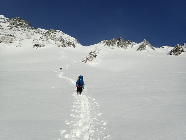 新雪は20cmほど、まっすぐザイテン脇を詰め上げる。