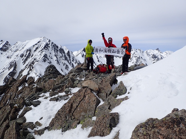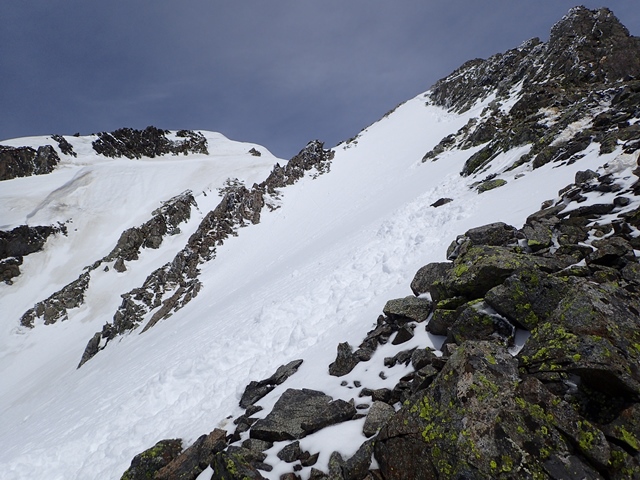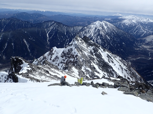 下り岩稜は意外と悪く、雪ごとずり落ちるのをこらえながら両手・両足・一歩づつ進む。