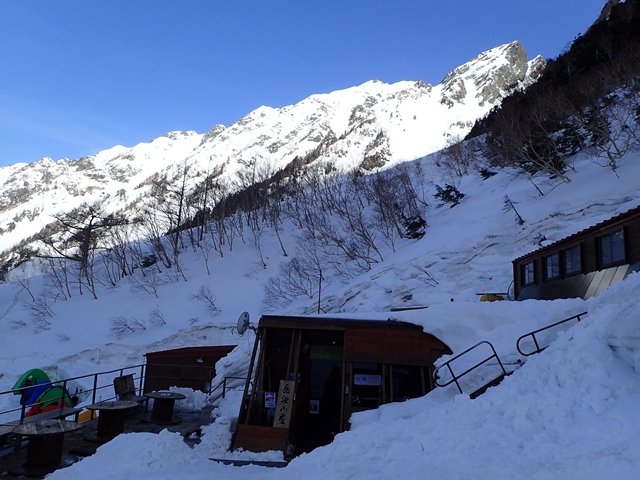 2時間ほどで早春の上高地へ下山。林道手前まで樹林の中の雪が凍結しつるつるになった斜面は緊張の連続だった。