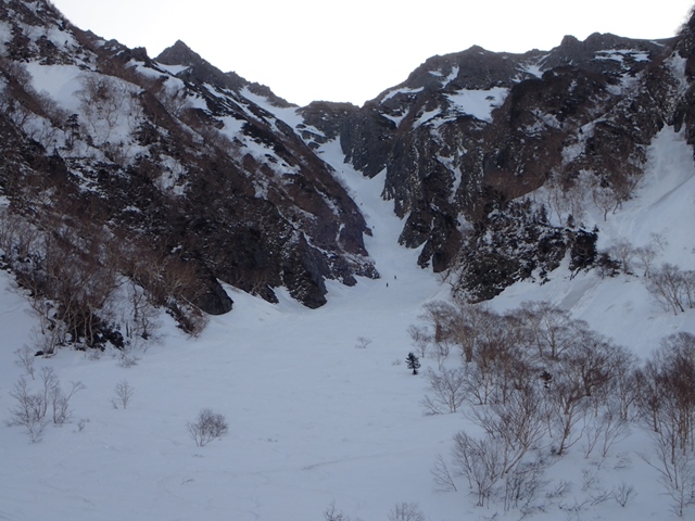 あとは慎重に奥明神沢を一気に岳沢へ向かって下降・・・とは言っても急傾斜なので・・・・