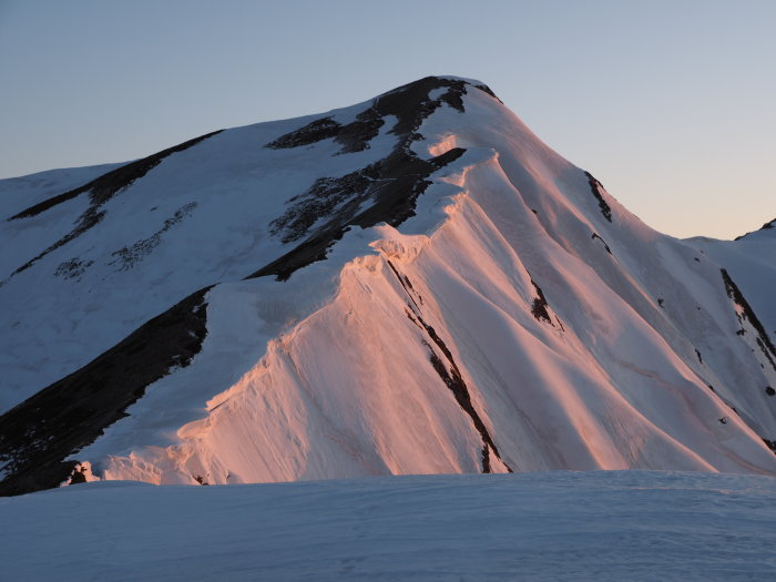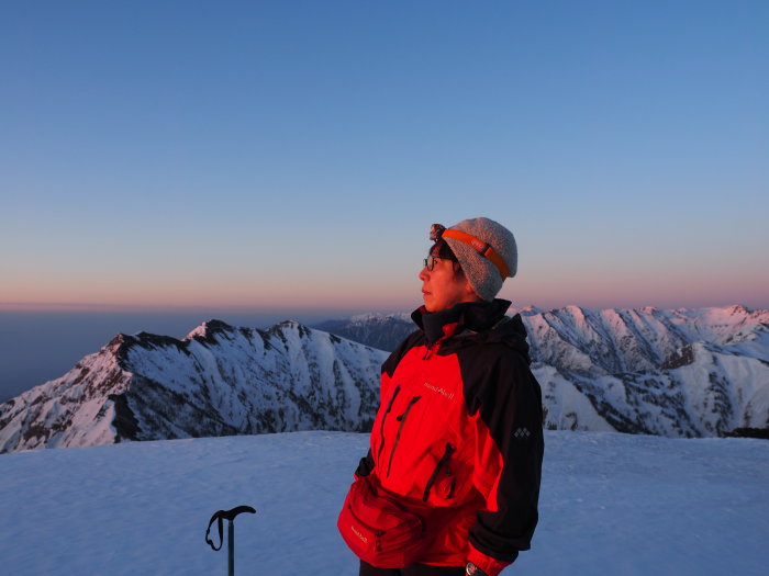 明け行く鹿島槍を眺めながらの登高。風も無く良い天気になりそうだ。