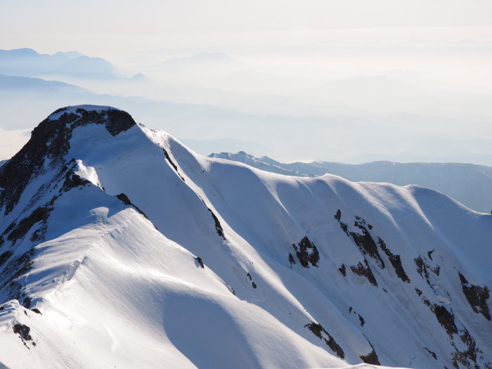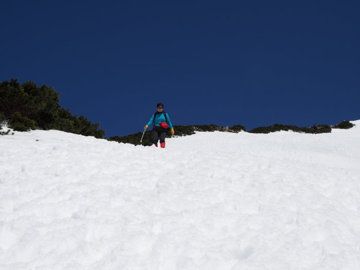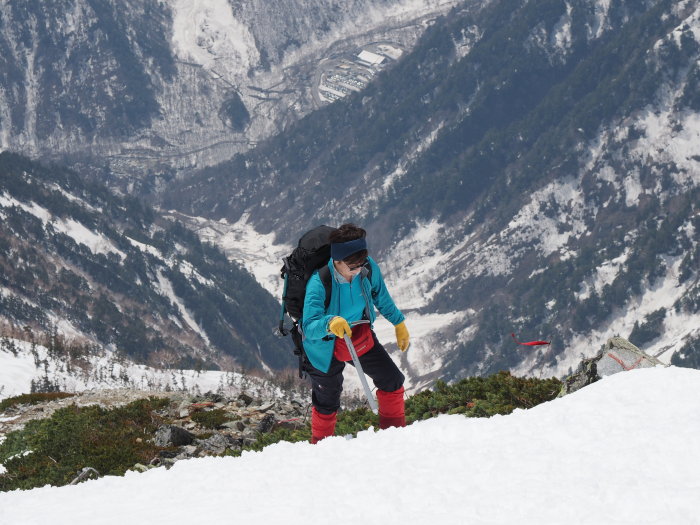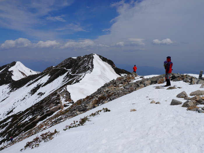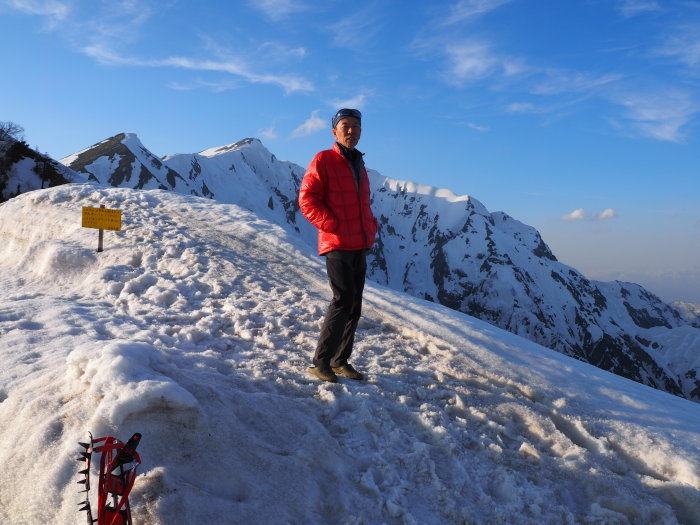 鹿島槍山頂で景色を堪能して北峰に向かうが夏道は雪の下、急峻な雪壁に時間が掛かりそうなので今回はパスして下山にかかる。