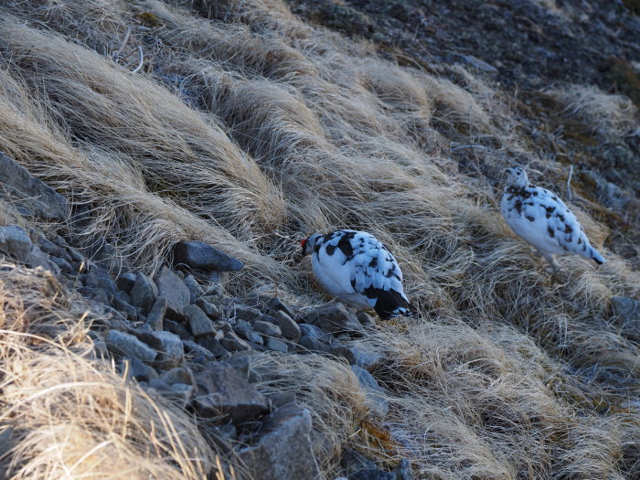 途中雷鳥夫婦に挨拶し雪の斜面を快適に下る。