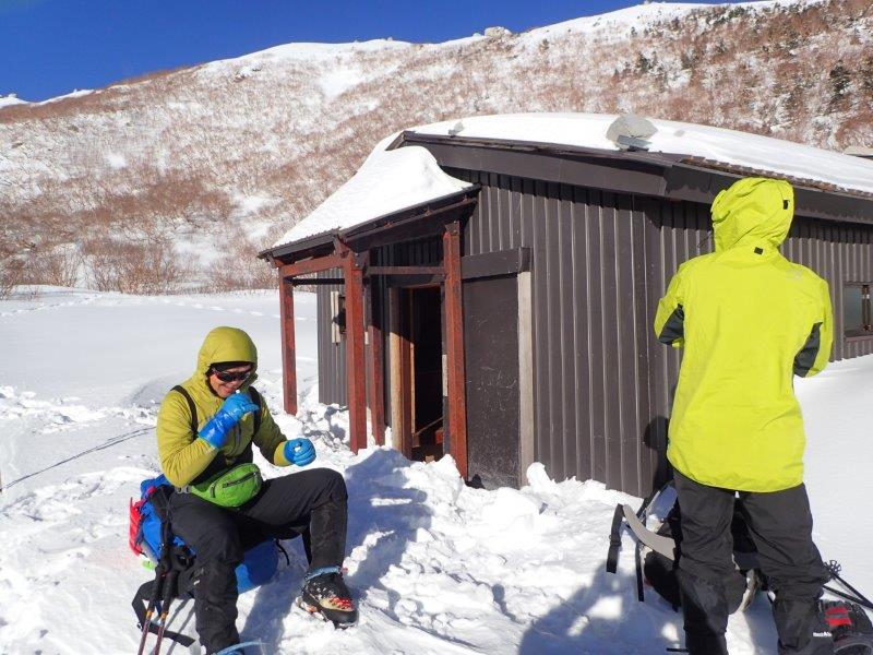 上部から降りてきた人の情報で小屋が使えそうだったのでラッセルして小屋へ行く。