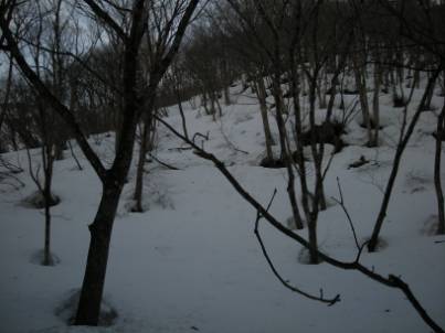 先を見ると雪がなだれていくし、藪の中をあと100mも登る気にもなれずにあえなくここで下山することにしました。