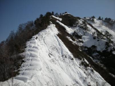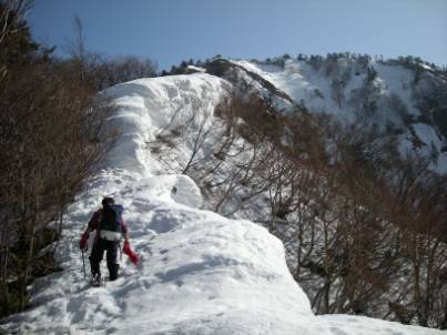 細い尾根をあがっていくが、雪庇が解けていて結構藪の中を歩く羽目になる。